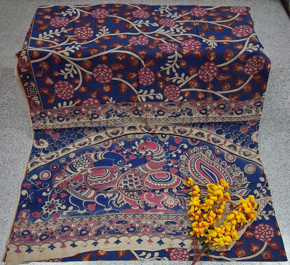 Kalamkari - Blue showcases exquisite hand-painted craftsmanship using natural dyes, featuring intricate traditional motifs in soothing blue tones. This fabric offers both cultural richness and timeless elegance, ideal for creating sophisticated apparel or decor that reflects authentic artistry. Its durable texture ensures longevity while maintaining delicate detail, perfect for connoisseurs seeking heritage-inspired design with refined quality.